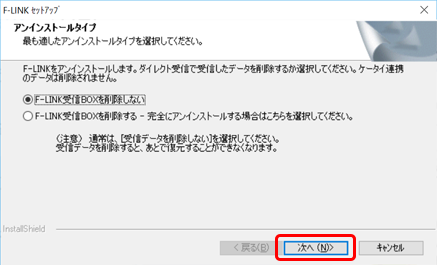 F-LINKのアンインストール時に「アンインストールタイプ」ウインドウが表示されますので、削除方法を選択して[次へ]をクリックしてください。