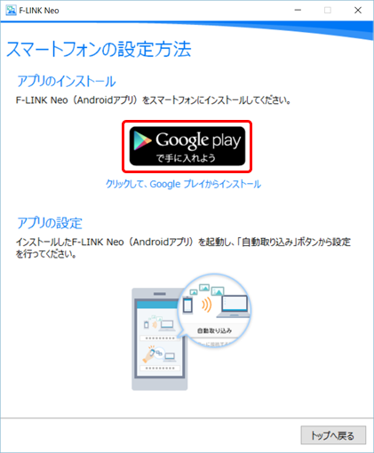 - Androidアプリのインストールを案内する画面が表示されます。「Google Playで手に入れよう」と書かれたボタンをクリックしてください(F-LINK NeoのAndroid版アプリは無料です)。
