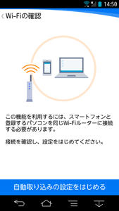 - 「Wi-Fiの確認」画面が表示されますので「自動取り込みの設定を始める」をタップしてください。