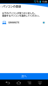 - 同じネットワーク内でパソコンが検索され、見つかればパソコンの登録画面が表示されます。「次へ」をタップしてください。