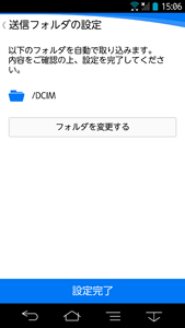 ※ 初期設定ではスマートフォン本体のDCIMフォルダーが設定されています。変更したい場合は「フォルダを変更する」ボタンをタップして、フォルダーを選択してください。