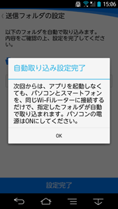 - 「自動取り込みの設定完了」が表示されますので、「OK」をタップし設定は完了です。