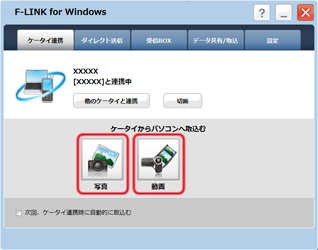※ [ケータイ経由でインターネットに接続]ボタンは、携帯電話が本機能に対応している場合で且つ、外出先などパソコンがルーターに接続されていない場合のみ表示されます。また2011夏モデル以降の「F-LINK」と「ウォーキング日記」がプリインストールされている機種は、歩数・活動量の取り込みボタンも表示されます。 - パソコンの「 F-LINK 」または「 F-LINK for Windows 」で表示されている[写真][動画]の取り込みボタンを押します。