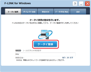 ([スタート] - [すべてのプログラム] - [ F-LINK ]から[ F-LINK ]を選択) - 「ケータイ連携」タブの中にある[ケータイ登録]ボタンをクリックします。