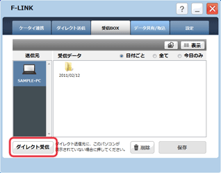 ([スタート] - [すべてのプログラム] - [F-LINK]から[F-LINK]を選択) - [受信BOX]をクリックし[ダイレクト受信]ボタンをクリックします。