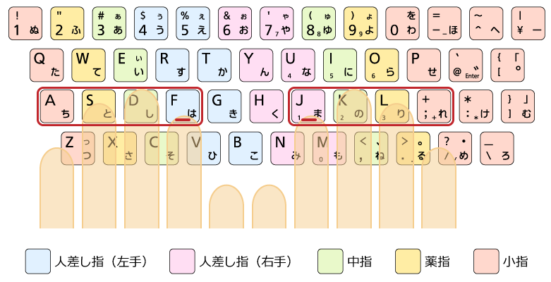 また、キーボードを早く正確に打つために、どの指でどのキーを押すのかを覚えましょう。