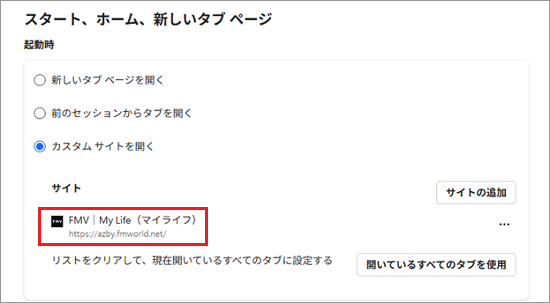 ブラウザを最初に開いたときに表示するページは変更することができます。ここではFMVマイページを最初に開くホームページにする方法を例に説明します。