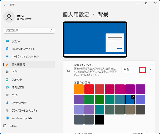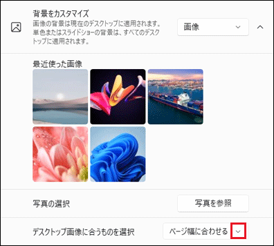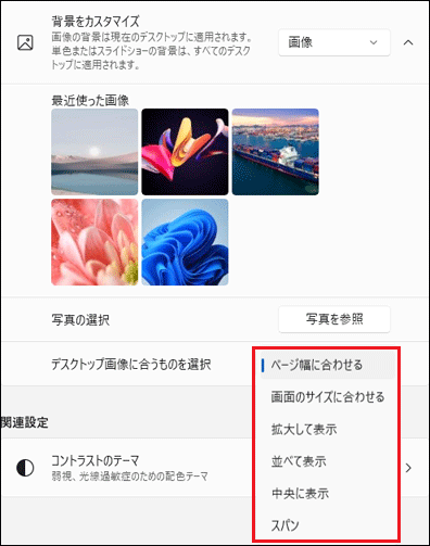 メニューが表示されます。お好みの調整方法をクリックし背景の表示方法を変更し、「×」ボタンをクリックして、「個人用設定」を閉じます。