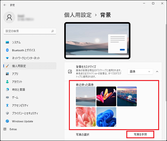 表示される一覧の中から、背景に設定する画像をクリックします。一覧に背景に設定したい画像がない場合は、「参照」ボタンをクリックし、表示された画面から画像が保存されているフォルダーを選択し、背景に設定したい画像をクリックします。