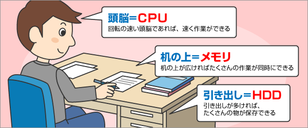 メモリは、いま処理しているデータを一時的に保存する場所のことです。CPUはパソコンの「頭脳」であることに対し、メモリのことは「机」に例えられることがよくあります。