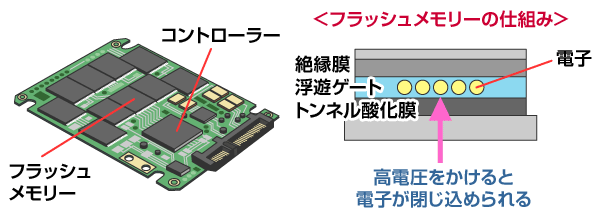 SSDは、シリコンの素子に電気的にデータを記録するしくみを持っています。これにより、高速なデータの読み書きを可能にしています。デジタルカメラの記憶装置SDカードなども同じしくみです。