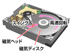 高速に回転する磁気ディスクに、磁気ヘッドでデータを読み書きする。