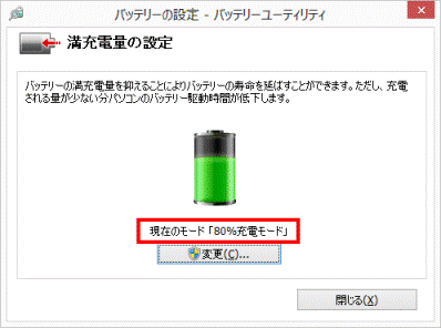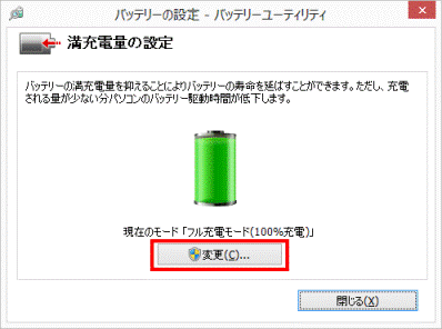 「バッテリーの設定」が起動し、「満充電量の設定」と表示されます。「変更」ボタンをクリックします。