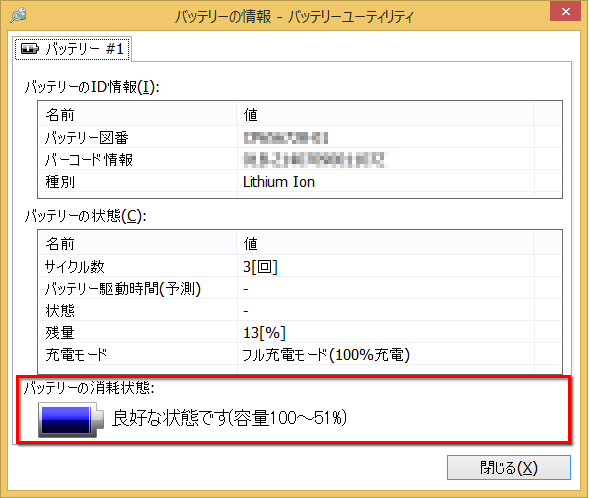 また、[バッテリーの情報]を選択すると以下のような表示がされ、バッテリーの消耗状態を確認することができます。