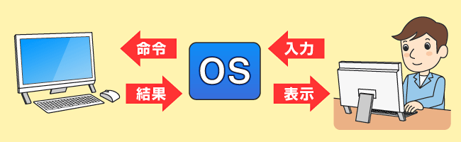 OSは、私たちがキーボードやマウスを使って出す命令をパソコンに伝え、パソコンが処理している内容をモニターに表示するなどして、私たちにわかる形にしてくれます。OSはパソコン全体を管理し、人間とパソコンの間に立って働いてくれる重要なソフトウェアなのです。