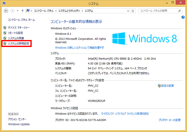 コントロールパネルで[システムとセキュリティ]の[システム]を表示して、[システムの詳細設定]を選択します。