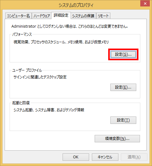 [詳細設定]タブの[パフォーマンス]の[設定]をクリックします。