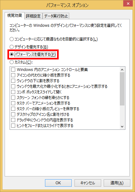 [視覚効果]タブで、[パフォーマンスを優先する]を選択します。