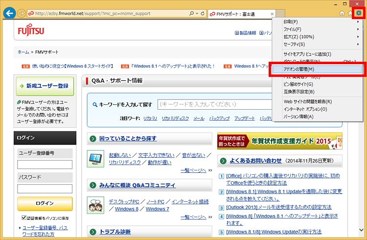 IE11の場合、[ツール]-[アドオンの管理]を選択します。