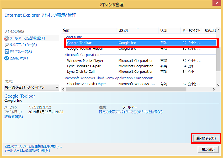 [ツールバーと拡張機能]で、不要なアドオンを選択し、[無効にする]をクリックします。