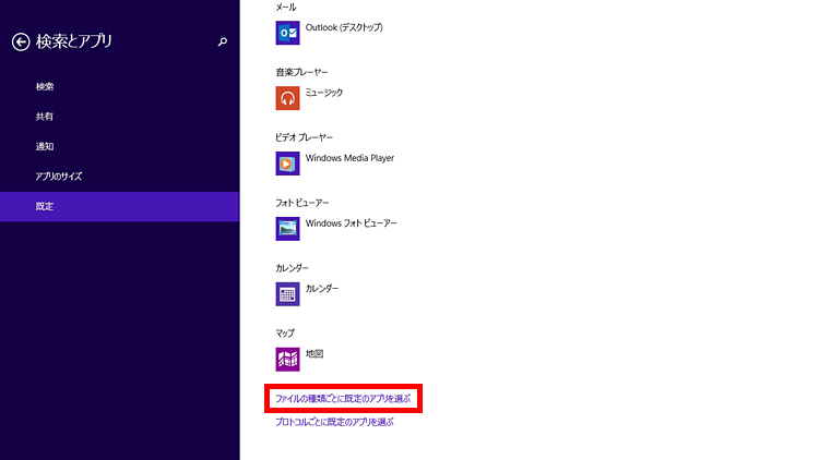 [既定のアプリの選択]画面下部の、[ファイルの種類ごとに既定のアプリを選ぶ]をクリックします。