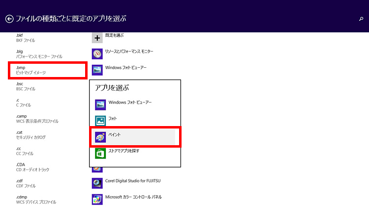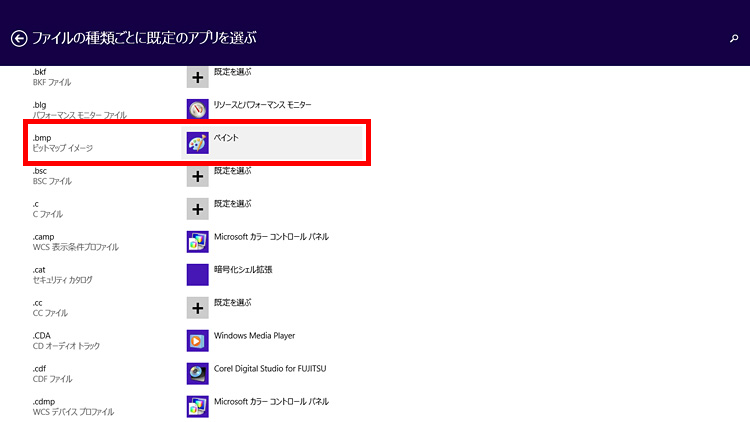 変更したいファイルの種類(ここでは.bmp)のアプリをクリックし、リストから既定のアプリに設定したいアプリを選択します。