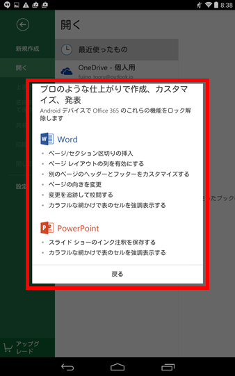 また、すべての機能を使いたい場合には、最後の画面で、「すべての機能を使うにはアップグレードしてください」をタップします。 利用できるのは、Office 365というパソコンやタブレット向けにオンラインでOfficeの機能が提供されるサービスです。個人で利用する場合、月額1,274円(2015年3月現在)の「Office 365 Solo」に申し込みます。WindowsパソコンまたはMac2台、タブレット2台、スマートフォン2台でOfficeの機能をフルに利用できるようになります。