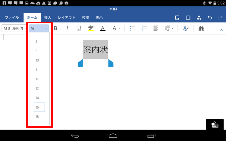 文字の範囲を指定して、「ホーム」タブでサイズを設定します。