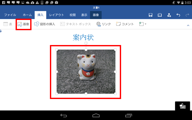 「挿入」タブの「画像」をタップして、写真を選択すると、挿入できます。