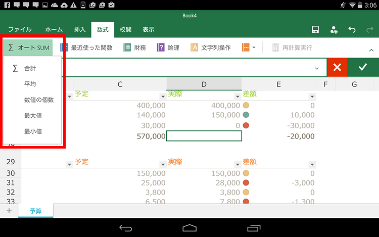 「数式」タブで、関数を入力して、計算できます。