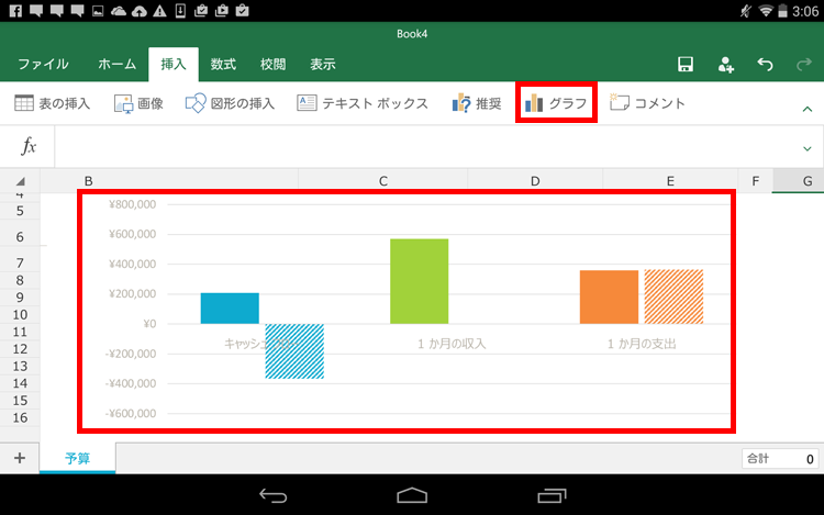 「挿入」タブでグラフの種類を選択して、グラフを作成します。