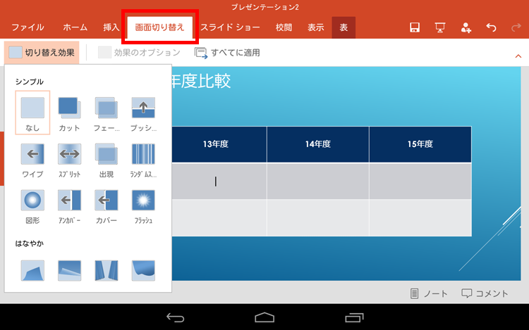 「画面切り替え」タブで、画面の切り替え効果を設定できます。