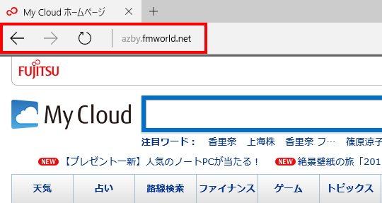 左から[戻る]ボタン、[進む]ボタン、[最新情報に更新]ボタン、アドレスバーが並んでいます。