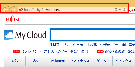 左から[戻る]ボタン、[進む]ボタン、アドレスバーが並んでいます。アドレスバーの右端には履歴表示や再読込のボタンが用意されています。