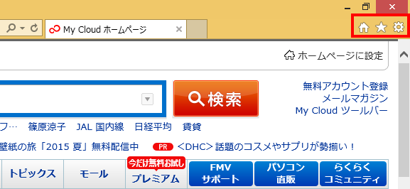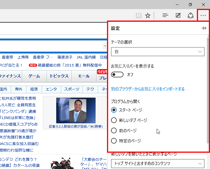 お気に入りを表示したり、設定の画面を表示したりするボタンが並んでいます。Microsoft Edgeに比べるとボタンが小さいのがわかります。