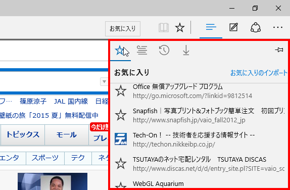 お気に入りの一覧です。[ハブ(お気に入り、リーディングリスト、履歴、ダウンロード)]ボタンをクリックし、[お気に入り]をクリックすると表示されます。