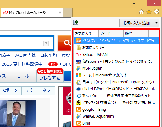 右上の[お気に入り、フィードおよび履歴を表示します]ボタンをクリックすると表示されるお気に入りの一覧です。