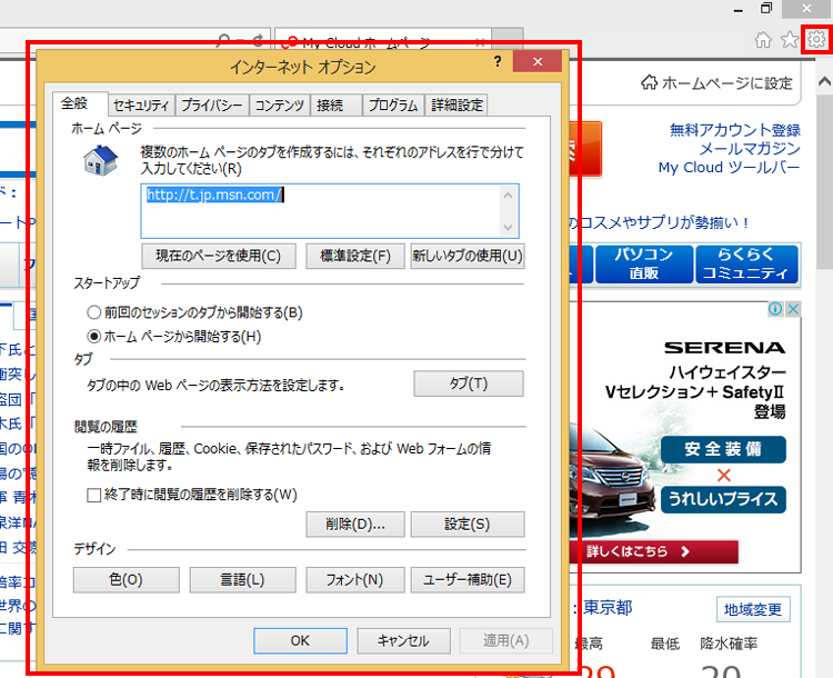 右上の[ツール]ボタンをクリックし、[インターネットオプション]を選択すると表示される設定のダイアログボックスです。