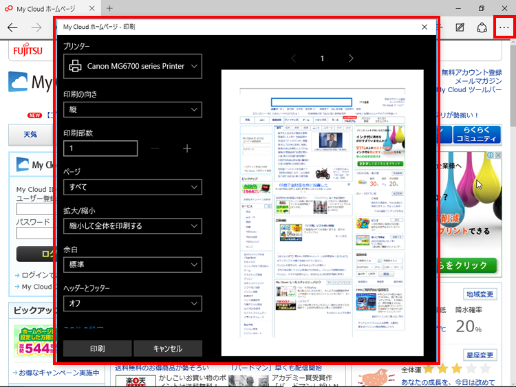 Microsoft Edgeでは、1つの画面で印刷設定と印刷状態を確認し、印刷を実行できます。一方、Internet Explorerの印刷設定は、従来のWindowsアプリケーションと共通で、同時に印刷状態を確認することはできません。