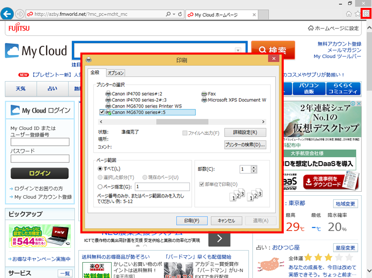 右上で[ツール]ボタンをクリックし、[印刷]→[印刷]を選択すると表示されるダイアログボックスです。