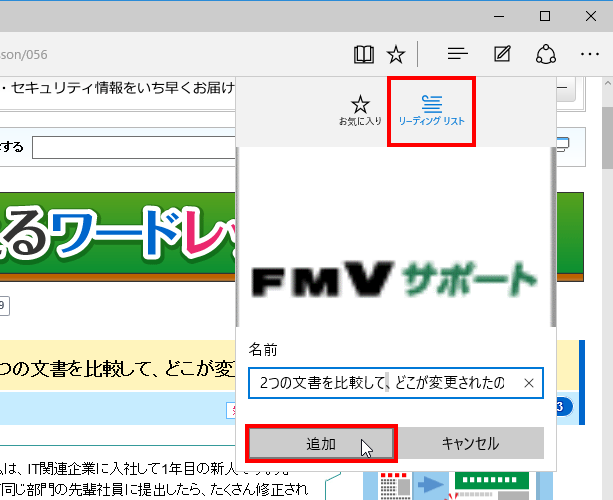 登録したいページを表示したら、[お気に入りまたはリーディングリストに追加]ボタンをクリックします。[リーディングリスト]を選択した後[追加]ボタンをクリックすれば登録できます。