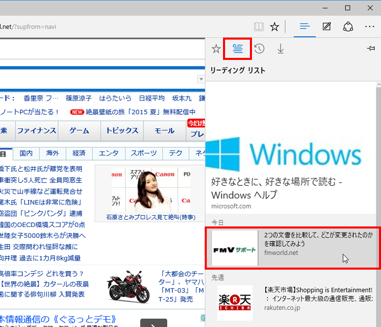 [ハブ(お気に入り、リーディングリスト、履歴、ダウンロード)]ボタンをクリックし、[リーディングリスト]ボタンをクリックして、リーディングリストを選択します。