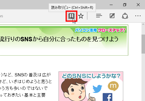 読み取りビューは、Webページをもとのレイアウトとは無関係に読みやすく表示する機能です。利用するには、操作メニューの[読み取りビュー]ボタンをクリックします。