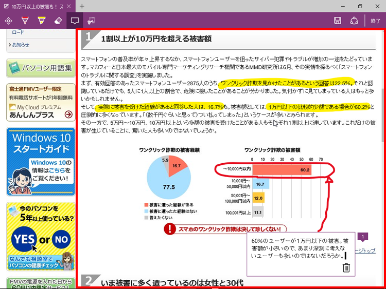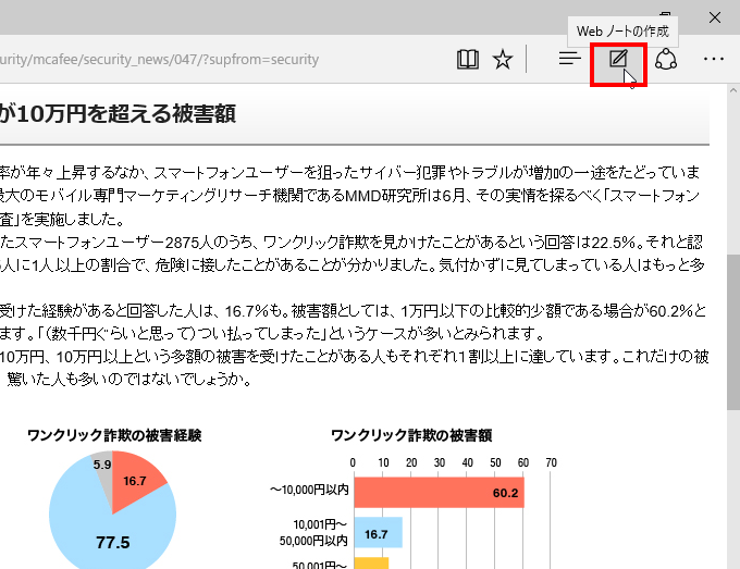 「Webノート」は、Webページに手書きの線を書き込んだり、コメントを入力したりできる機能です。ネットで調べごとをしているとき、ページ中の気になる文章に線を引いたり、関連ページのURLを書き込んだりといったことが手軽にできます。特にタッチペンが使えるWindows 10を搭載したタブレットだと便利でしょう。これまでになかった機能だけに、アイデア次第でいろいろな活用方法が生まれそうです。