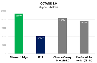 Microsoft Edgeの方がInternet Explorerより約2.3倍高速であるという結果になっています。OCTANE 2.0は、Googleが開発・提供しているJavaScriptの処理速度を計測するツールです。