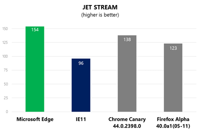 Microsoft Edgeの方がInternet Explorerより約1.6倍高速であるという結果になっています。JET STREAMは、Appleが開発・提供しているJavaScriptの処理速度を計測するツールです。