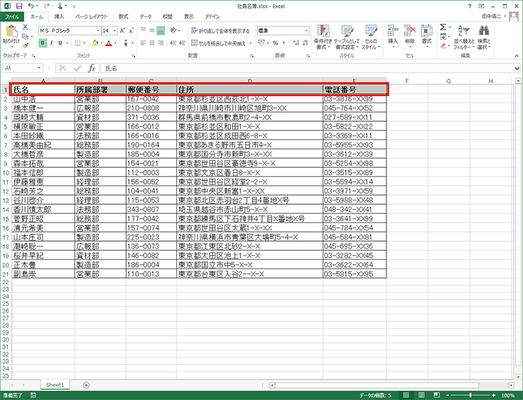 並べ替えを使うには、表の1行目に入力されている「氏名」「所属部署」などの項目が列見出しとして認識される必要があります。そのために、2行目以降とは異なる書式を設定します。ここでは例として、1行目を太字にします。