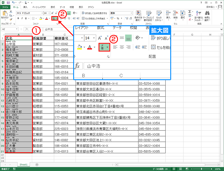 ふりがなを確認する範囲を選択し、[ホーム]タブの[ふりがなの表示/非表示]をクリックすると、このようにふりがなが表示できます。