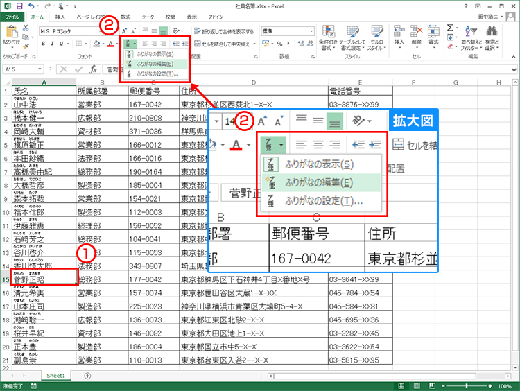 間違ったふりがながある場合は、そのセルを選択して[ふりがなの表示/非表示]の[▼]をクリックし、 [ふりがなの編集]をクリックします。
