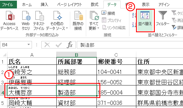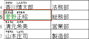 氏名のように漢字で入力されているデータは、入力時のふりがな情報を元に並べ替えが行われます。そのため、本来と異なる読みから変換した場合は、正しく並べ替えができません。事前にふりがなを確認して、間違っているものは修正しておきましょう。